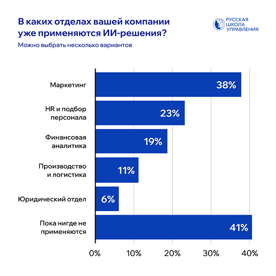 Самым популярным направлением для внедрения ИИ* остается маркетинг: 38% компаний уже используют технологии в этой сфере — от таргетированной рекламы до анализа поведения клиентов. На втором месте — HR и подбор персонала: 23% респондентов применяют ИИ при найме и взаимодействии с кандидатами. Также ИИ задействован в финансовой аналитике (19%), производстве (11%), логистике (11%) и юриспруденции (6%).