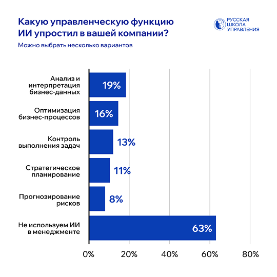 Но сегодняшняя практика выглядит скромно. 63% компаний пока не используют ИИ в управлении вообще. Из тех, кто его применяет, чаще всего решает точечные задачи*: анализ и интерпретация бизнес-данных (19%), оптимизация процессов (16%) и контроль задач (13%). Еще реже ИИ участвует в стратегическом планировании (11%) и прогнозировании рисков (8%).